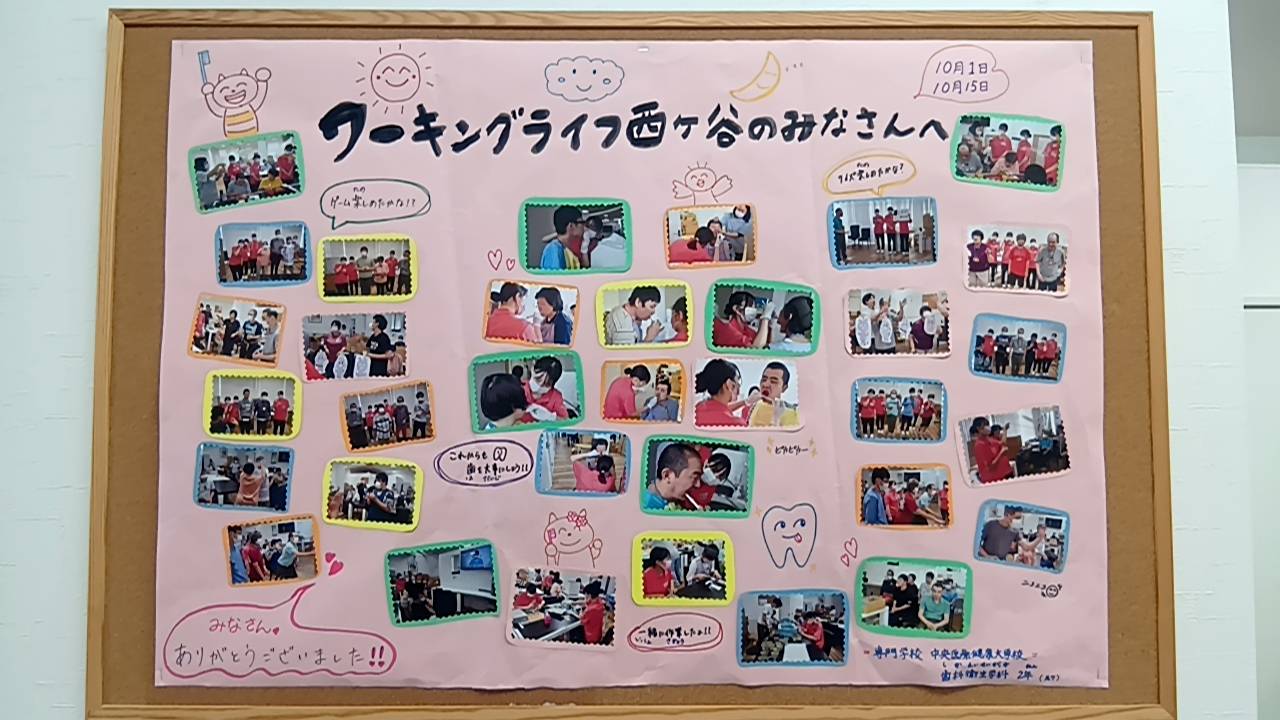 歯科衛生士学科の学生さん 2025.11.14 ブログ 今年も中央医療健康大学校の歯科衛生士学科の学生さんが10月1日、15日の2日に渡り実習に見えました。 それぞれ3名づつ1日のみの実習でしたが、利用者の皆様と一緒に作業をしたり、歯磨き指導を受けたり、 レクリエーションを通し、楽しく過ごす事が出来ました。 投稿者: Owner ブログ 自主製品の紹介前の記事